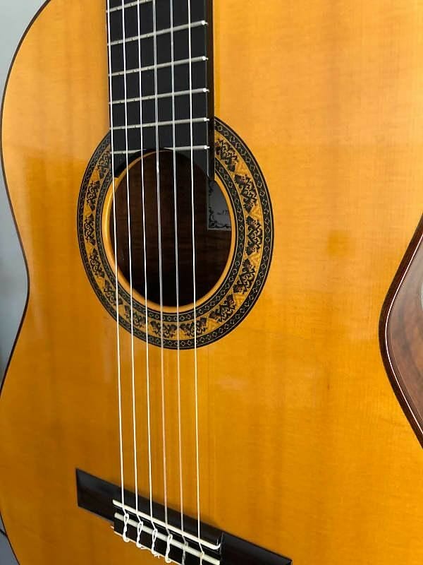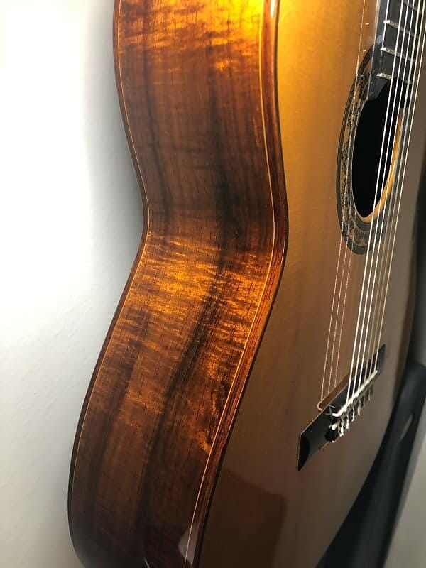 También entre sonido moderno (lattice) y tradicional La guitarra está diseñada con un refuerzo de celosía hecho de fibra de carbono. Este tipo de refuerzo permite el uso de tapas más delgadas que resuenan mejor. La parte posterior (arqueada) y los lados están hechos de madera negra australiana sólida.