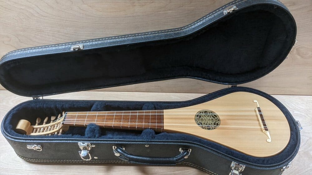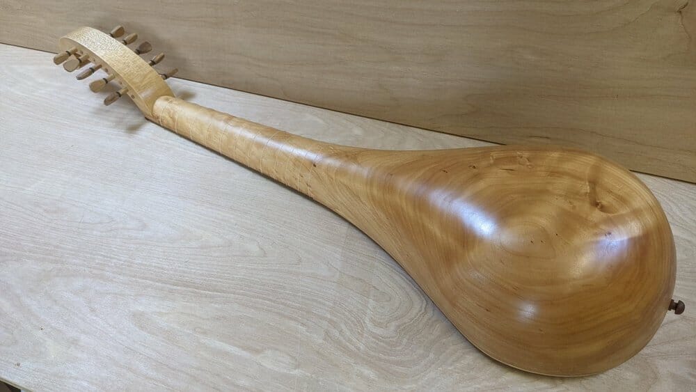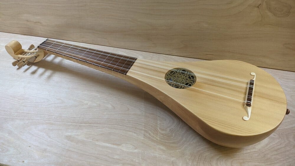 55 cm scale . 12 Frets. Strung in Nylgut and PVF . 5 double courses. Currently set up for G d g c’ f’