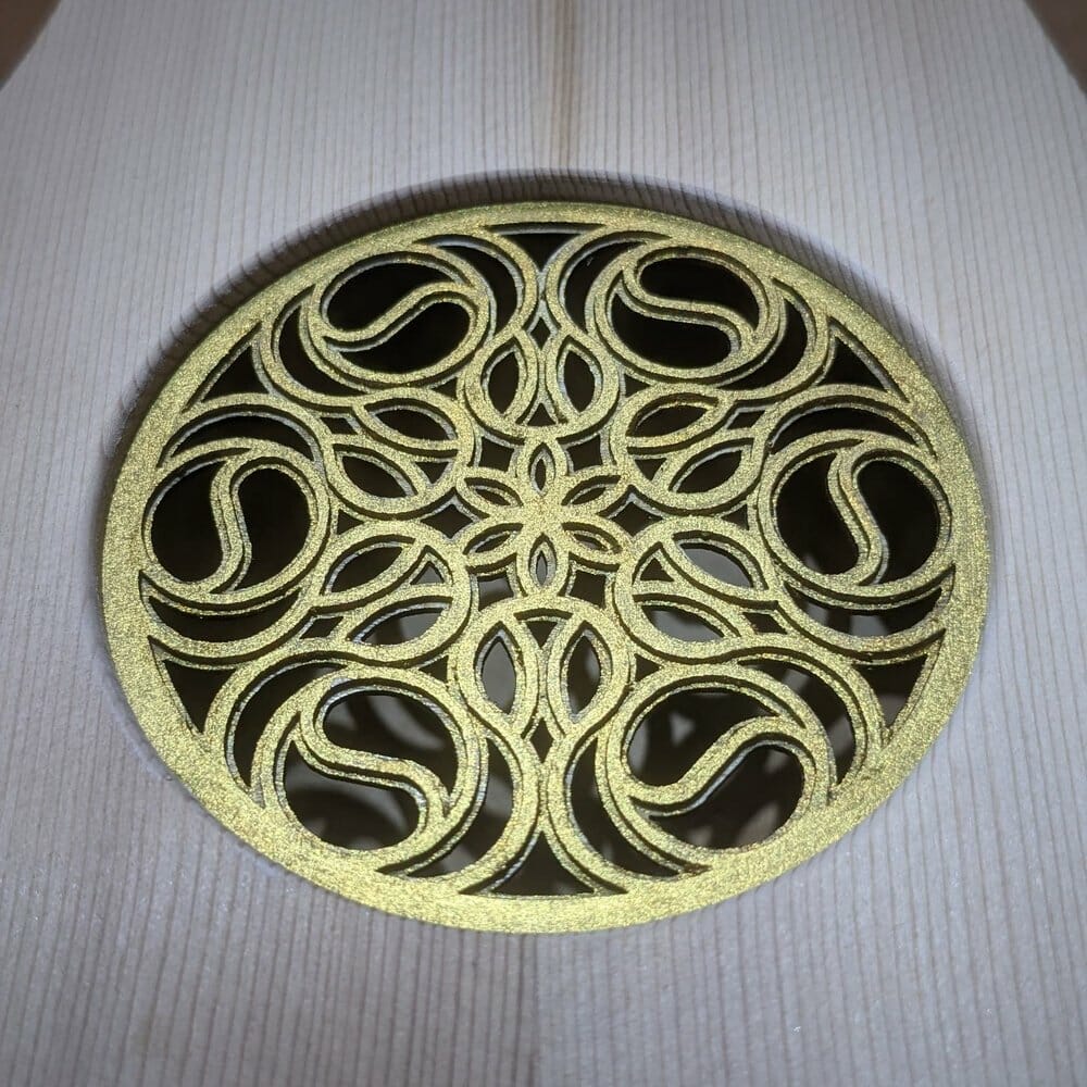 Soundboard over 60 years mature. Two layer rose, gilded.