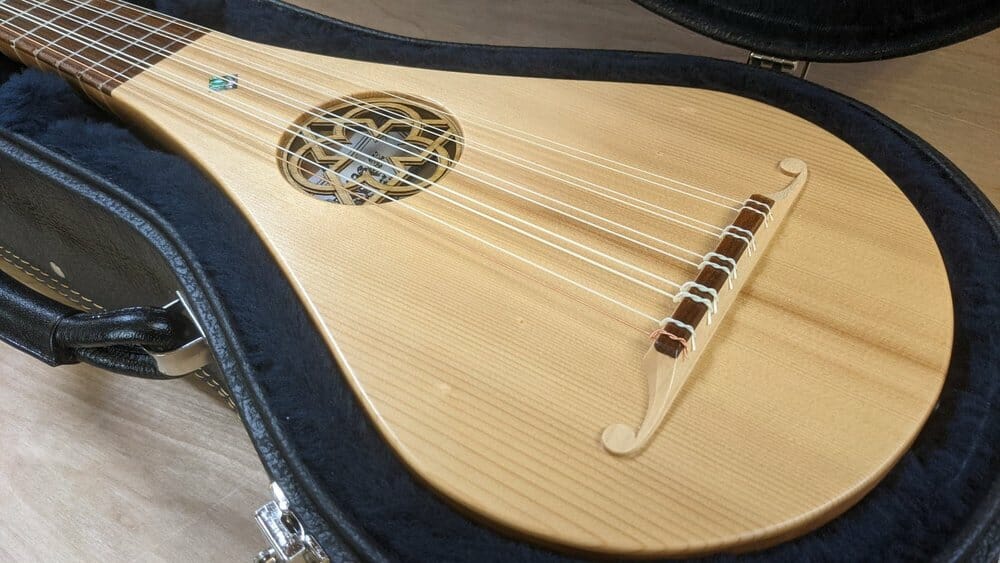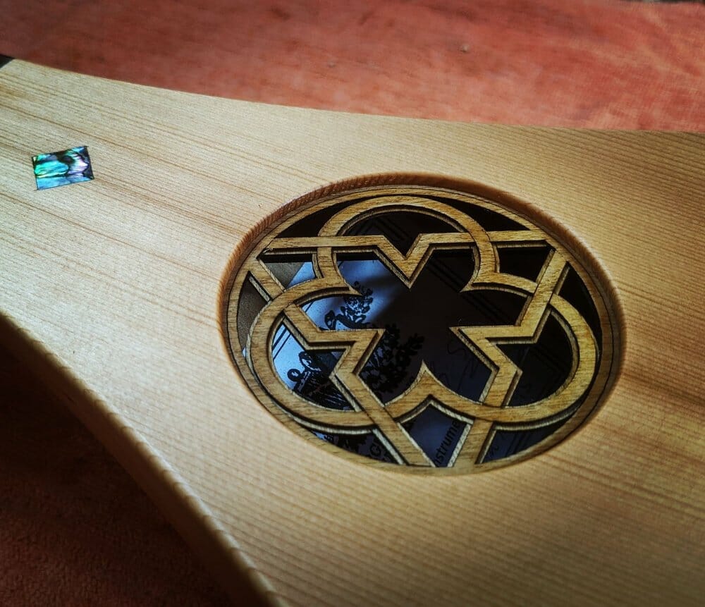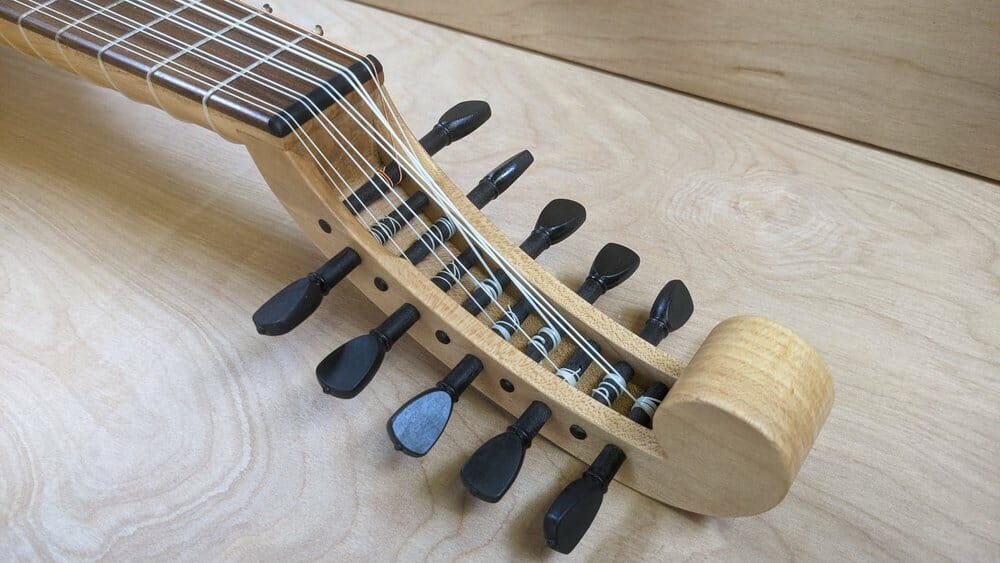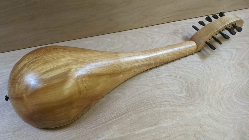 45 cm scale with 9 frets on the fingerboard. 5 double courses strung in Nylgut and PVF. Set up for tuning d a d’ g’ c’’