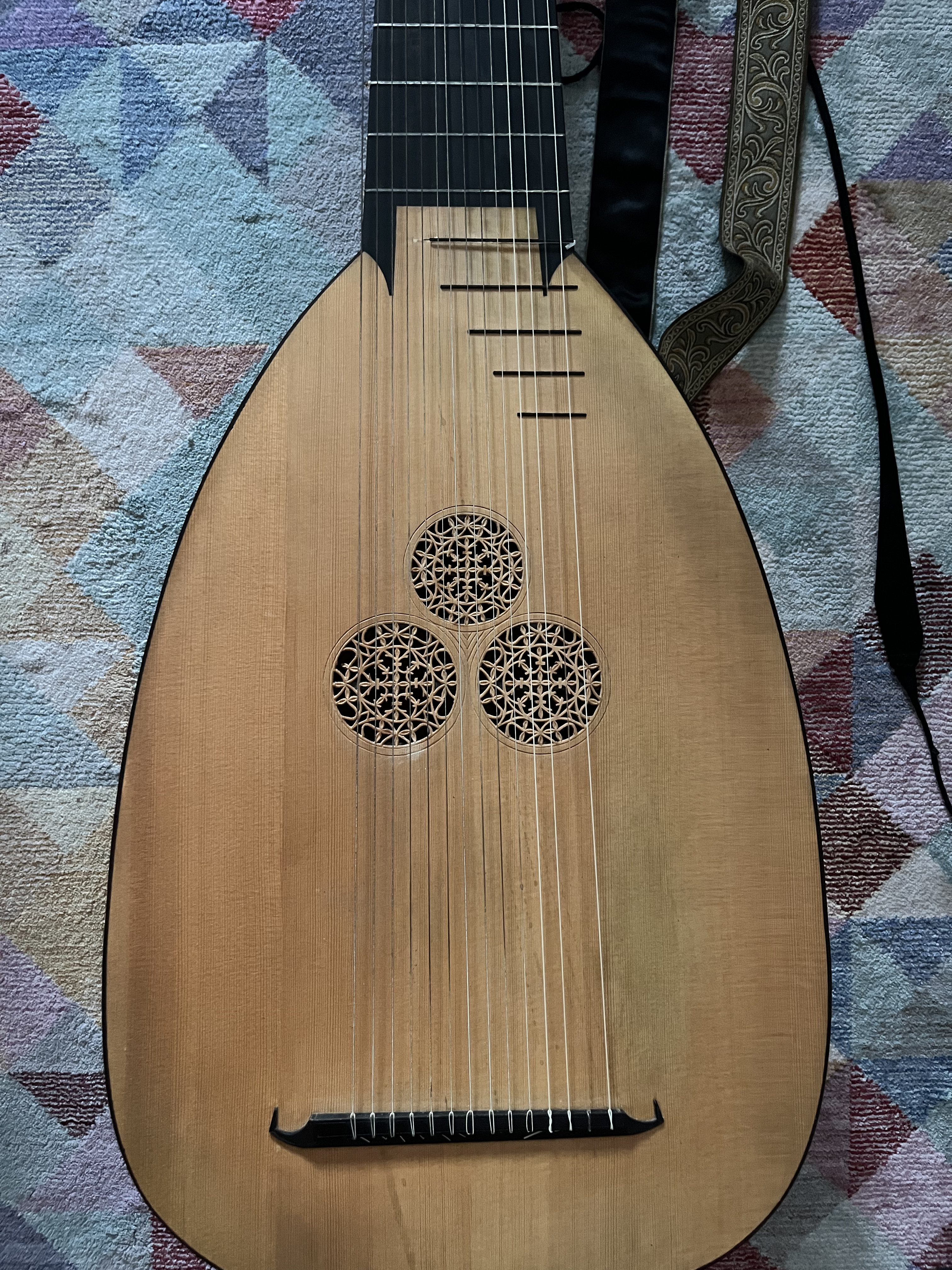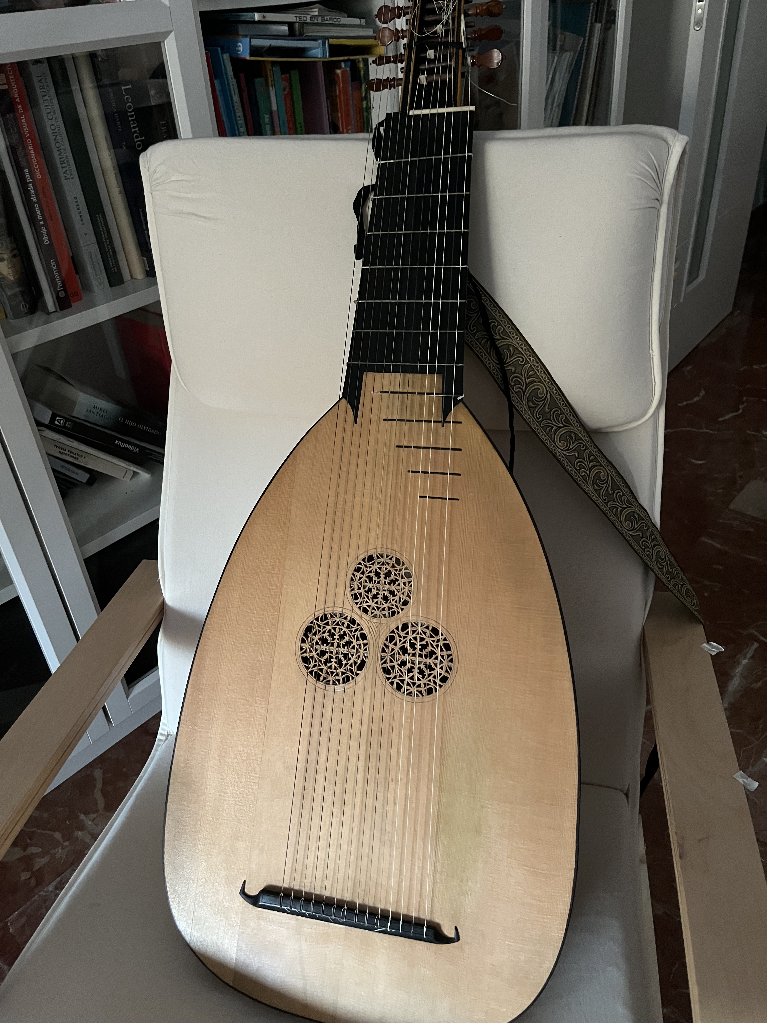 Juan de Dios is selling a theorbo built by Nicanor Oporto in 2003.