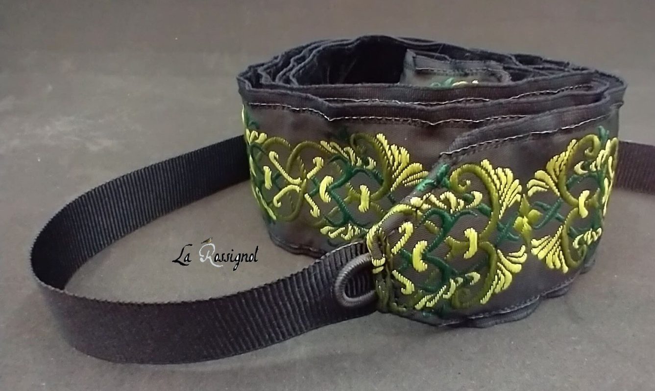 John Dowland: a Strap in dark and elegant colors, black and green, decorated with geometric and plant motifs.
