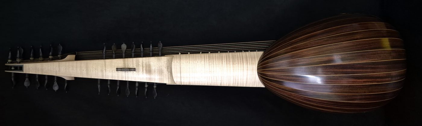 Laúd en G de 58cm de longitud vibrante. Fabricado por Adrian Dodd y Lawrence Dodd (2023) basado en el retablo de Masaccio, c. 1426. Construido para ser tocado con púa o con los dedos. El cuerpo y el mástil son de sicomoro ondulado y tiene características medievales inusuales, incluyendo dos rosas, un puente invertido, un [...]